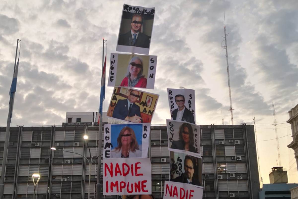 La multitudinaria marcha tuvo a la víctima de femicidio en el centro de la escena. El rostro de Fátima apareció en varios de los carteles que se vieron en todas las instantáneas. A la llegada a Casa de Gobierno y al final de la jornada se escuchó la consigna “A dónde están los responsables de que Fátima no está”. El cartel que más se vio fue el que mostraba al gobernador, Gustavo Bordet; el intendente Adán Bahl; los procuradores general y adjunta Jorge García y Cecilia Goyeneche; el fiscal de género Leandro Dato; y la ministra de Gobierno, Rosario Romero. Todos con sus ojos tapados, como ironía a la “falta de respuestas”.