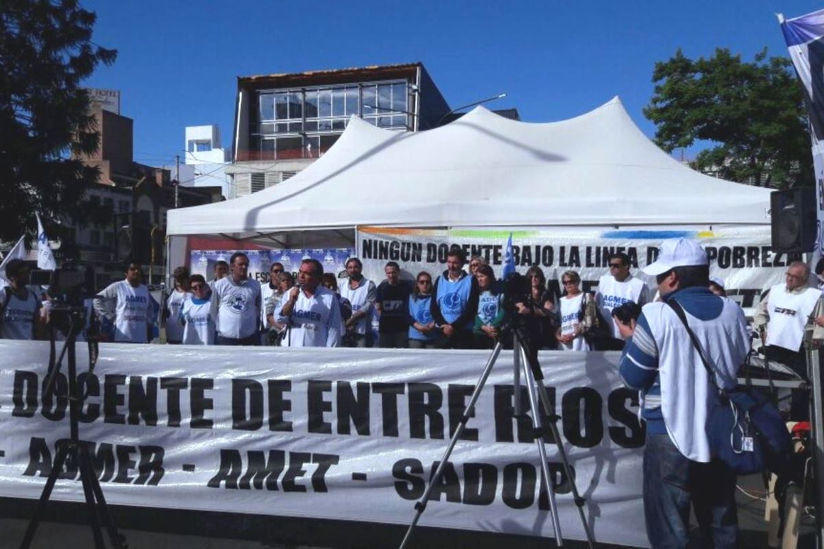 La Asociación Gremial del Magisterio de Entre Ríos (Agmer) encara el conflicto educativo en dos frentes. Por un lado la conducción central, que es quien sostiene la carpa en el marco del Frente Sindical Docente, que incluye a los demás gremios del sector (AMET, UDA y Sadop). Por el otro lado, la seccional Paraná, que mantiene la toma del salón del Consejo General de Educación (CGE). En la asamblea de esta mañana se decidió no dar tregua y mandar telegramas obreros con el objetivo de dejar explicitado que por los descuentos en los salarios por los días de paro, los docentes no se pueden presentar en la escuela, por lo tanto el horario se va a cumplir en el mismísimo hall del CGE. Se mocionó también para pedirle a la conducción central que el congreso que debe sesionar este viernes en La Paz se traslade a Paraná y realizarlo frente a Casa de Gobierno para no vaciar los dos espacios (el acampe y la toma), supo Página Política. La apertura del diálogo- así se dejó manifestado en la asamblea – sería con la devolución de los descuentos. Otro reclamo fue que los legisladores, por ley, deroguen las resoluciones por las que se ejecutan los descuentos y los directivos de las escuelas tienen que notificar las ausencias.