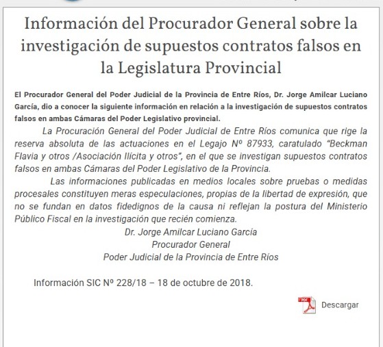 Las publicaciones daban cuenta sobre quiénes deberían recaer las responsabilidades de las contrataciones y, según los procedimientos, en los presidentes de los cuerpos legislativos. Cuando la idea de las imputaciones se multiplicaron en la prensa, el procurador general, Jorge Amilcar Luciano García, que no suele emitir opinión, esta vez sí lo hizo en un comunicado con fecha del 18 de octubre:
