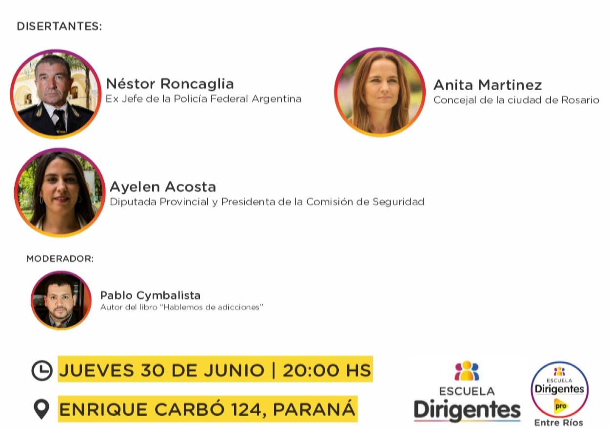 Con motivo de celebrarse la semana de la lucha contra las adicciones, se desarrollará en la capital entrerriana una charla debate sobre Narcotráfico y Adicciones que contará con la disertación de Néstor Roncaglia (ex jefe de la Policía Federal Argentina), Ayelén Acosta (presidenta de la Comisión de Seguridad de la Cámara de Diputados de Entre Ríos) y Anita Martínez (Concejal de Rosario).