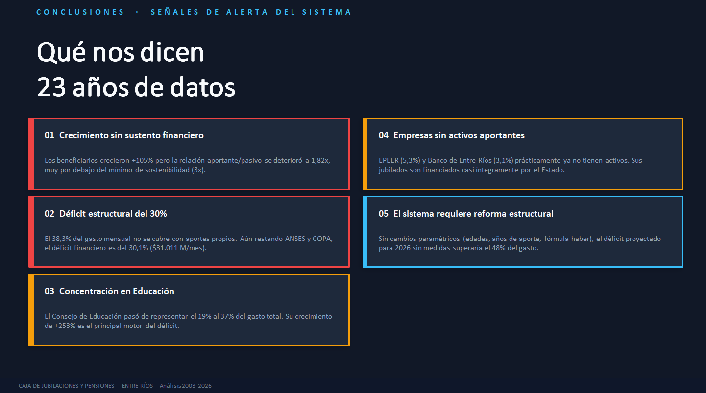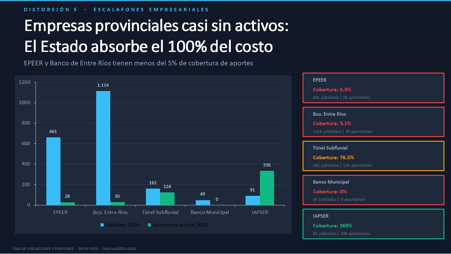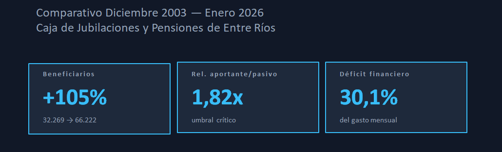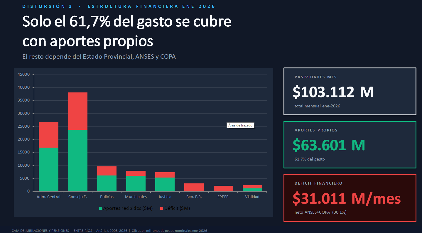 Son 5.000 millones de pesos por mes que se llevan los jubilados del Banco de Entre Ríos y de Epeer, pero sin aportes. Cuando esas empresas se privatizaron, los activos pasaron a aportar a Nación y no se hizo una reserva actuarial que cubra esos aportes para la Caja provincial. Es un vacío que el Estado provincial (todos los entrerrianos que pagan impuestos) cubre hace dos décadas. Son 60.000 millones de pesos por año; algo así como 1.000 millones de dólares en aportes que no entraron a la Caja. ¿Algún responsable político?