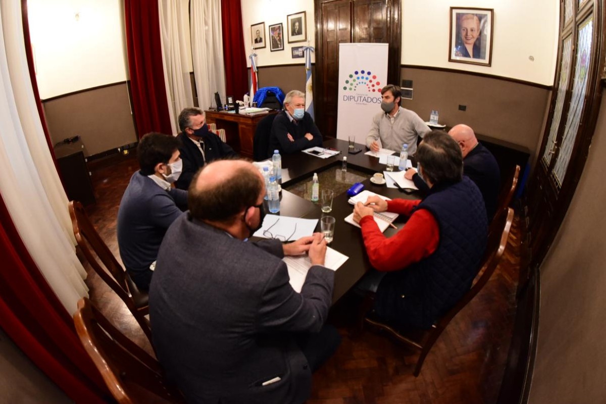 El presidente de la Cámara de Diputados de Entre Ríos, Angel Giano, y los presidentes de los bloques Gustavo Cusinato (UCR), Esteban Vitor (PRO), Juan Navarro (PJ Frente Creer), Juan Domingo Zacarías (MSE), junto al secretario y prosecretario del órgano legislativo, Carlos Saboldelli y Nicolás Pierini, mantuvieron este miércoles la reunión de labor parlamentaria donde acordaron seguir avanzando en la democracia digital y los temas que serán tratados este jueves en la sesión ordinaria.