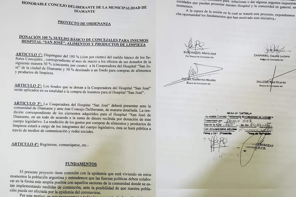 Los cuatro concejales de Diamante del Partido SER, que representan la primera minoría en la ciudad, decidieron donar sus haberes de marzo para atender necesidades en el marco de la emergencia sanitaria por coronavirus.