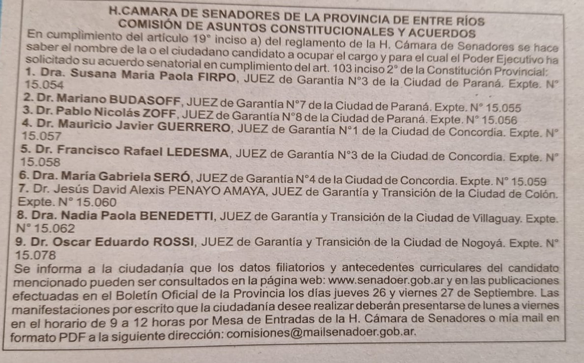 En el Senado está abierto el período de impugnación para los juzgados de Garantía 1,7 y 8 de Paraná; 3 y 4 de Concordia; de Garantía y Transición de Colón; Villaguay y Nogoyá.