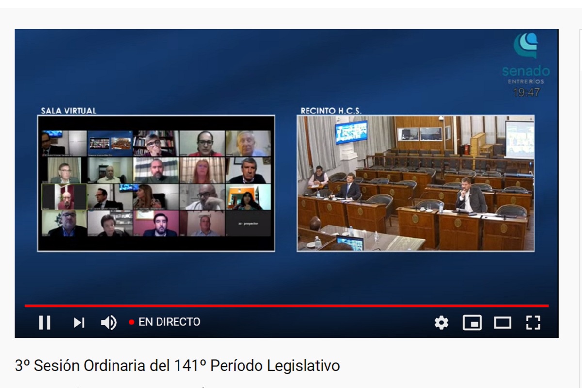 Con la presencia en el recinto de la vicegobernadora Laura Stratta; los presidentes de bloque, Armando Gay y Francisco Morchio; las autoridades y taquígrafos, y con los 15 senadores restantes en videoconferencia, se logró retomar la dinámica de sesiones de la Cámara Alta.