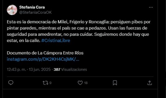 La primera reacción fue de los legisladores nacionales de La Cámpora. La senadora Stefanía Cora, en su cuenta de X, apuntó a los gobiernos nacional y provincial. “Esta es la democracia de Milei, Frigerio y Roncaglia”.
