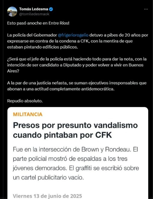Lo mismo hizo el diputado Tomás Lededsma. “La policía del Gobernador @frigeriorogelio detuvo a pibes de 20 años por expresarse en contra de la condena a CFK, con la mentira de que estaban pintando edificios públicos”, dijo el legislador.
