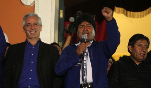 El presidente de Bolivia apareció en el balcón del Palacio presidencial cuando aún no se conocían los resultados oficiales. Escoltado por su vicepresidente y todos los miembros de su gabinete, el mandatario agradeció el voto de los bolivianos.