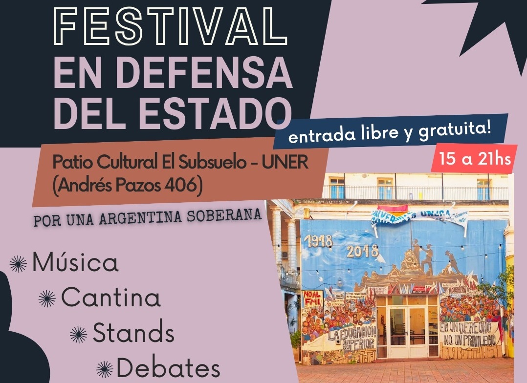Organizado por la facultades de Trabajo Social, Ciencias Económicas y Ciencias de la Educación de la UNER, se llevará adelante el Festival en defensa del Estado “Por una Argentina soberana”. La actividad será el viernes 31 de mayo de 15 a 22 en el Patio del Subsuelo (Andrés Pazos 406).