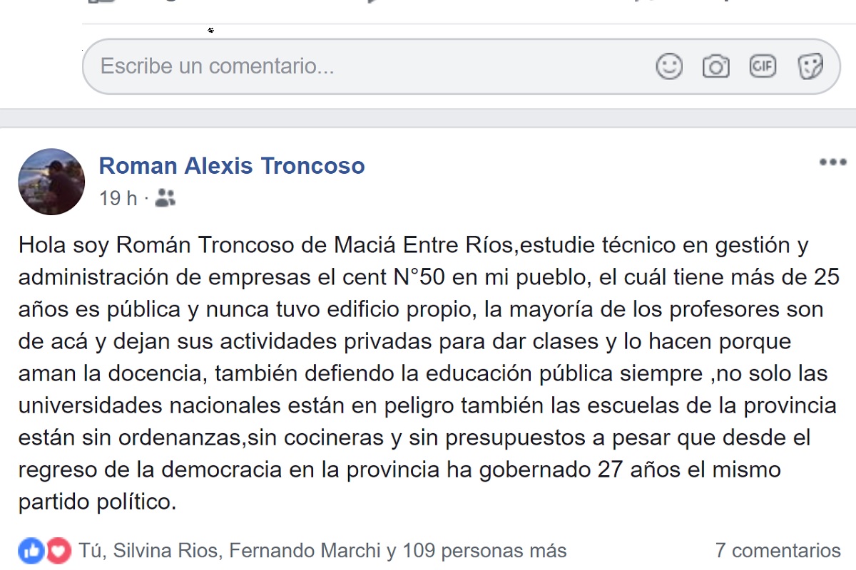 Cuando todo en Facebook era la repetición de “Soy… estudié en la facultad…” que exige al gobierno de Mauricio Macri más presupuesto para las universidades nacionales, Troncoso insertó su planteo en las redes sociales.