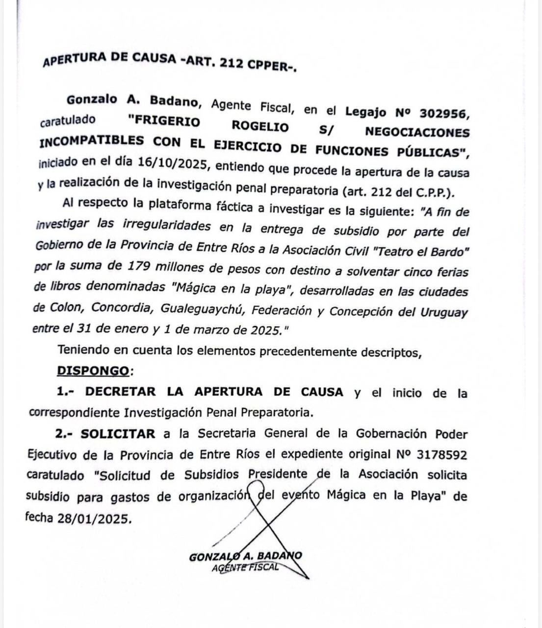 Publicó textual este medio: “El fiscal Gonzalo Badano inició una apertura de causa con el objetivo de ‘investigar las irregularidades en la entrega de subsidio por parte del Gobierno de la Provincia de Entre Ríos a la Asociación Civil Teatro del Bardo por la suma de 179 millones de pesos con destino a solventar cinco ferias del libro’” y “dispuso decretar la apertura de causa y solicitar a la Secretaría General de la Gobernación, a cargo de Mauricio Colello, ‘el expediente original 3178592 caratulado ‘Solicitud de subsidios presidente de la Asociación solicita subsidio para gastos de la organización del evento Mágica en la Playa’ de fecha 28/01/2025’”. A continuación la nota completa: