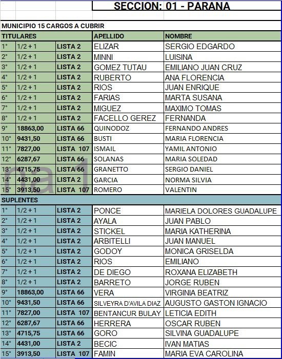A partir del noveno se integran los nombres de Guzmán: Fernando Quinodoz, Florencia Busti, Yamil Ismail, Soledad Solanas y Sergio Granetto. Luego aparece Norma García, del sector de Romero; y recién en el lugar 15 Valentin Romero, de Mathieu.