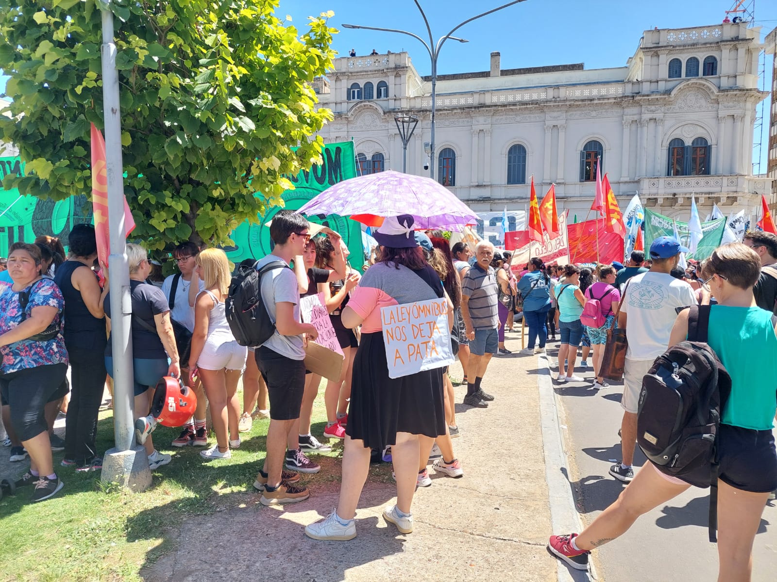 “Tanto el DNU 70/23 y como el proyecto de Ley Ómnibus significan un verdadero golpe institucional que se suma a la brutal política de ajuste, desocupación y entrega de la soberanía nacional. No es con medidas contra los trabajadores y las trabajadoras, ni contra los pequeños y medianos productores de la ciudad y el campo que se resolverán las urgencias del país”, dice el documento que se leyó al finalizar la movilización y el acto en el frente de Casa de Gobierno.