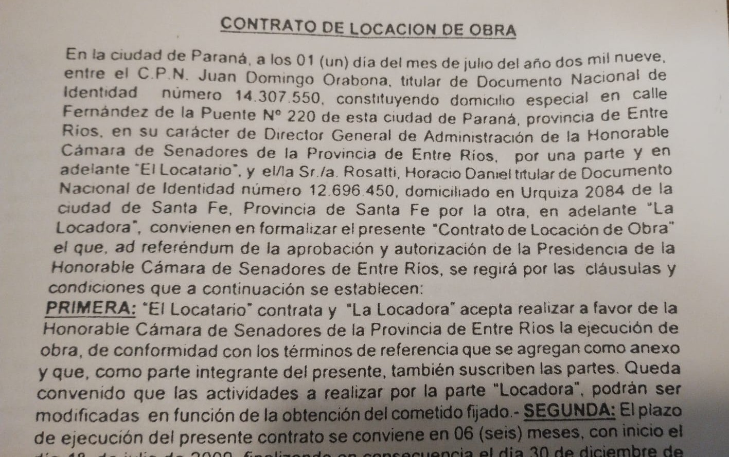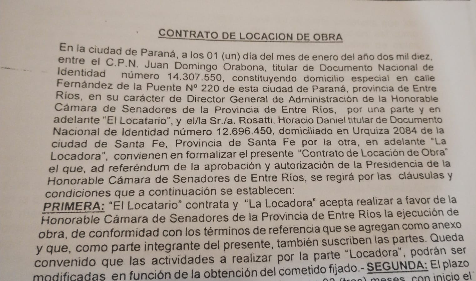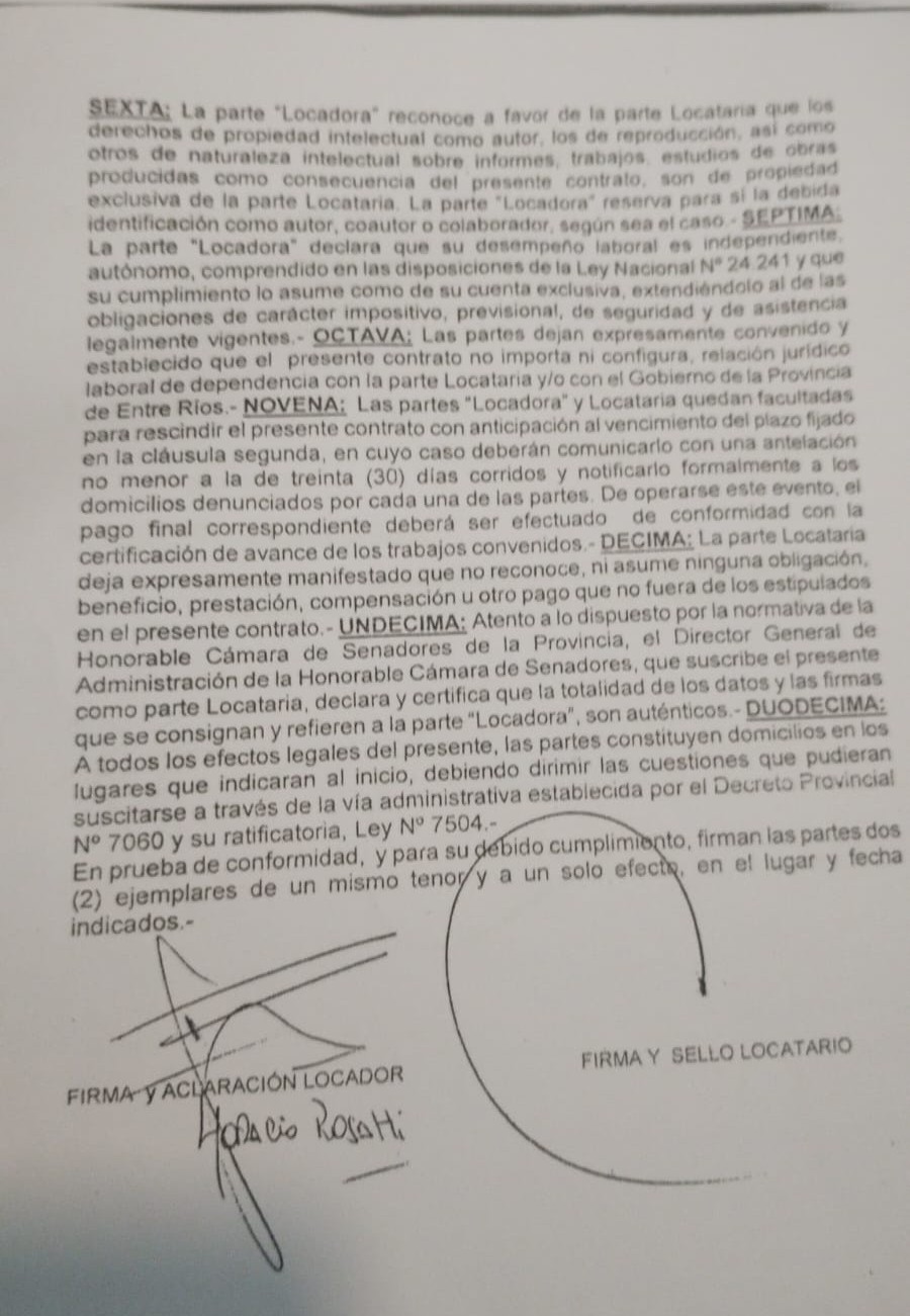 Es interesante el primer párrafo de los contratos a los que tuvo acceso Página Política. Dicen que el mismo queda “ad referéndum de la aprobación y autorización de la Presidencia de la Honorable Cámara de Senadores de Entre Ríos”. Una evidencia inapelable sobre la responsabilidad de los contratos en la Legislatura que el Ministerio Público Fiscal, desde el 20 de septiembre del 2018 a la fecha, se niega a analizar.