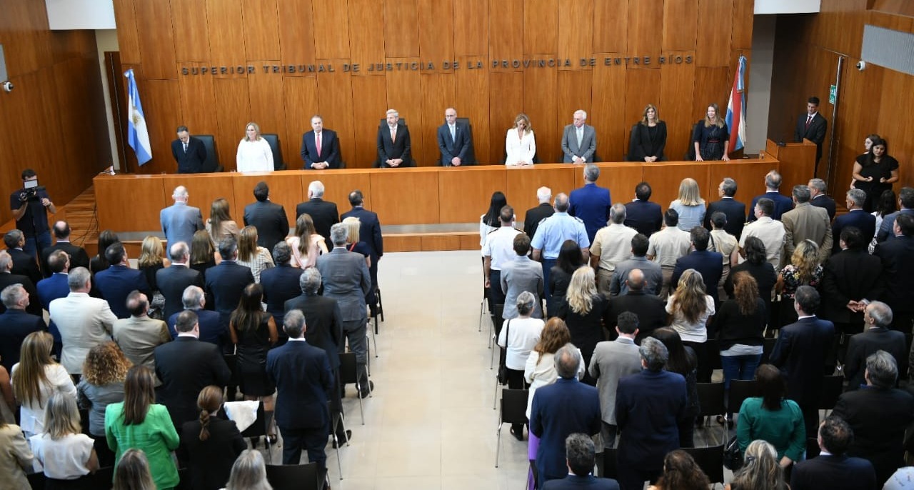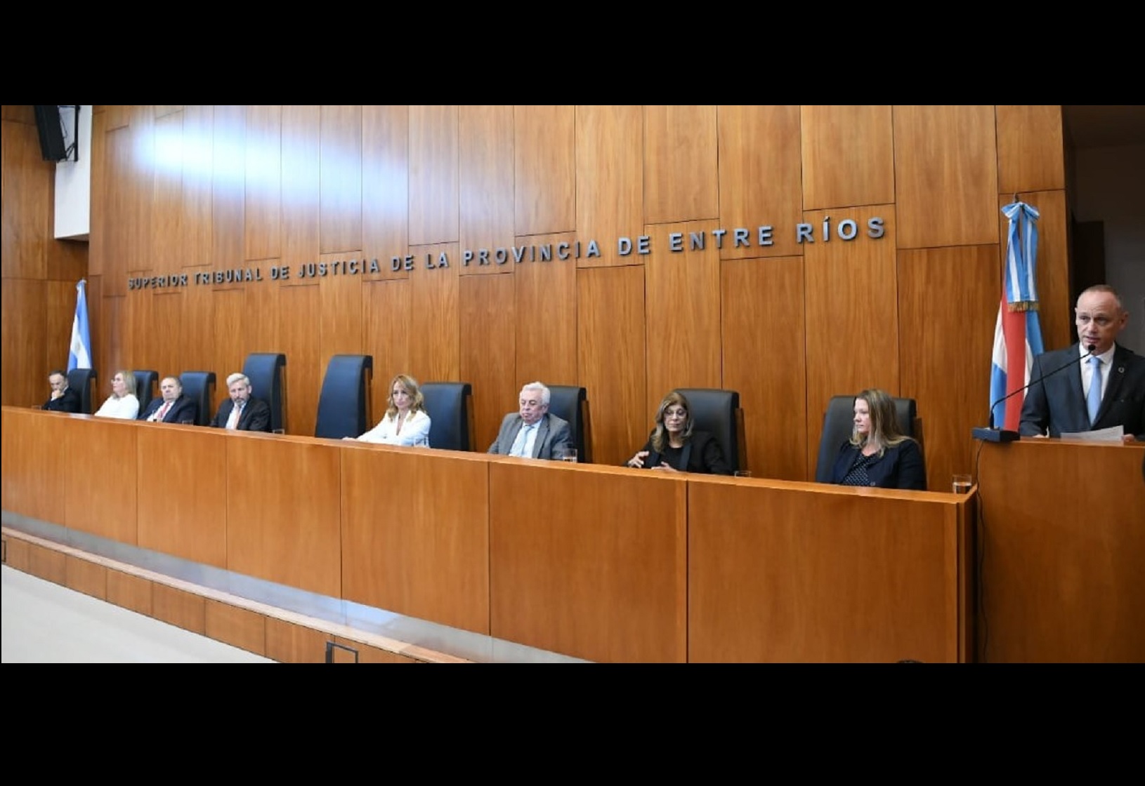 Lo flanqueaban la vicepresidenta del STJ, Laura Mariana Soage; y sus pares Daniel Carubia, Germán Carlomagno, Susana Medina, Claudia Mizawak, Miguel Ángel Giorgio y Gisela Schumacher. Además asistieron el procurador general, Jorge Amílcar García; y el defensor general, Maximiliano Benítez.