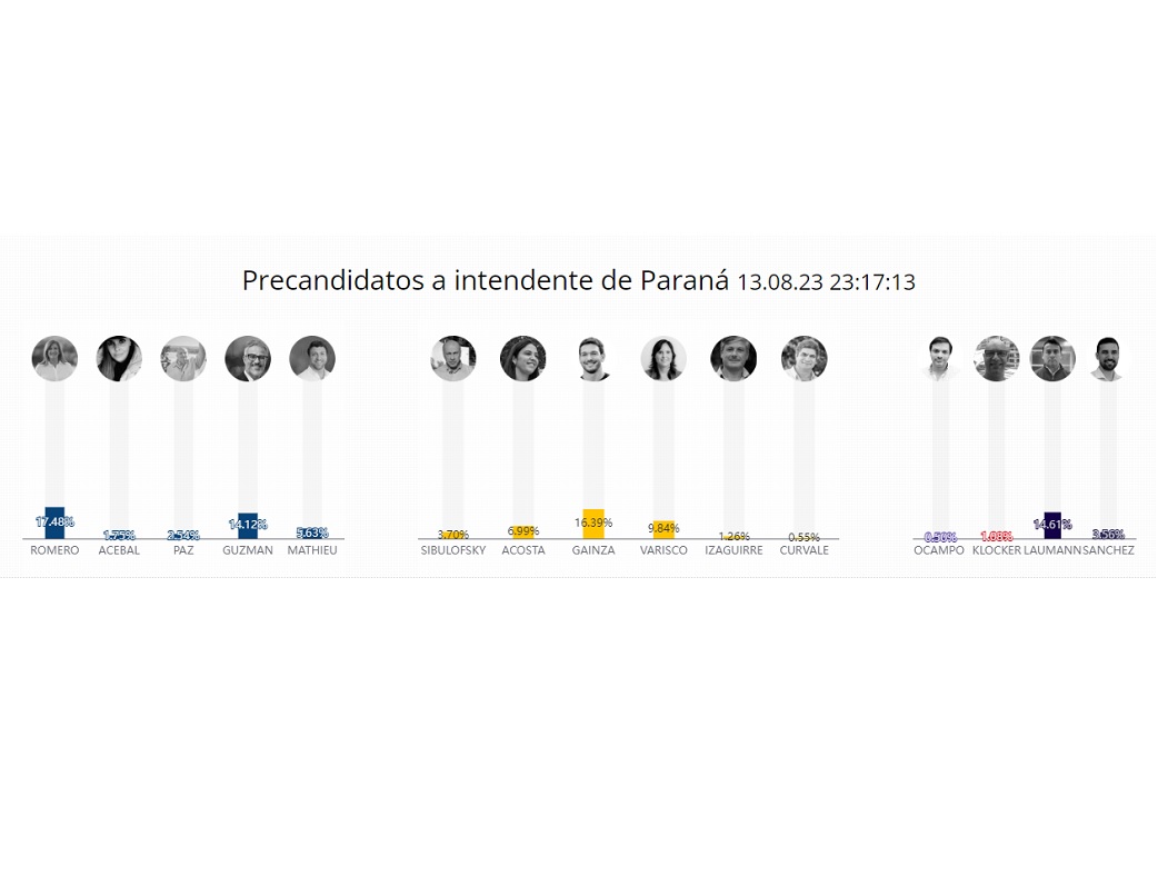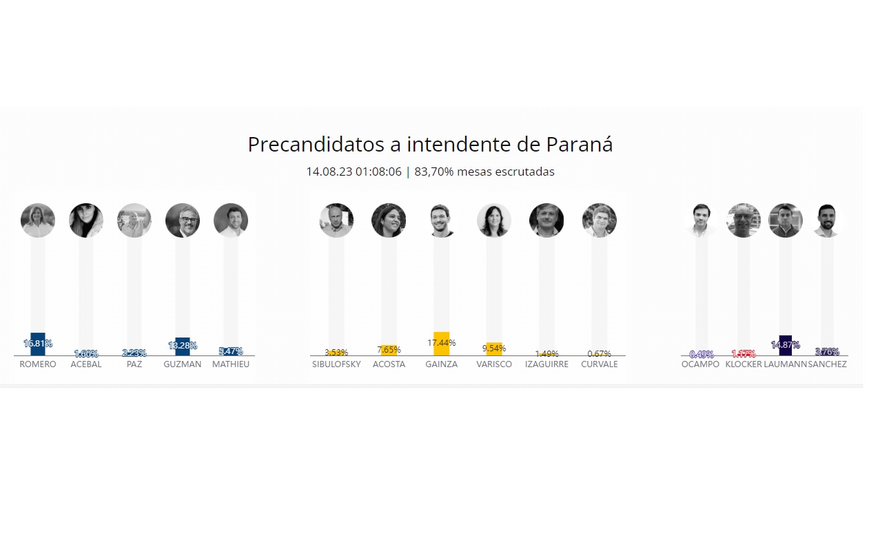 Si el escrutinio confirma los datos parciales Romero enfrentará a Emanuel Gainza que se impone en la interna de Juntos para el Cambio de Paraná. Gainza fue la opción del 17,4% de los paranaenses; seguido en la contienda por Lucía Varisco que trepa al 9,5%; por Ayelén Acosta, con el 7,6%; y Fernando Sibulofsky, con el 3,5%, todos precandidatos que pegaron con Rogelio Frigerio.