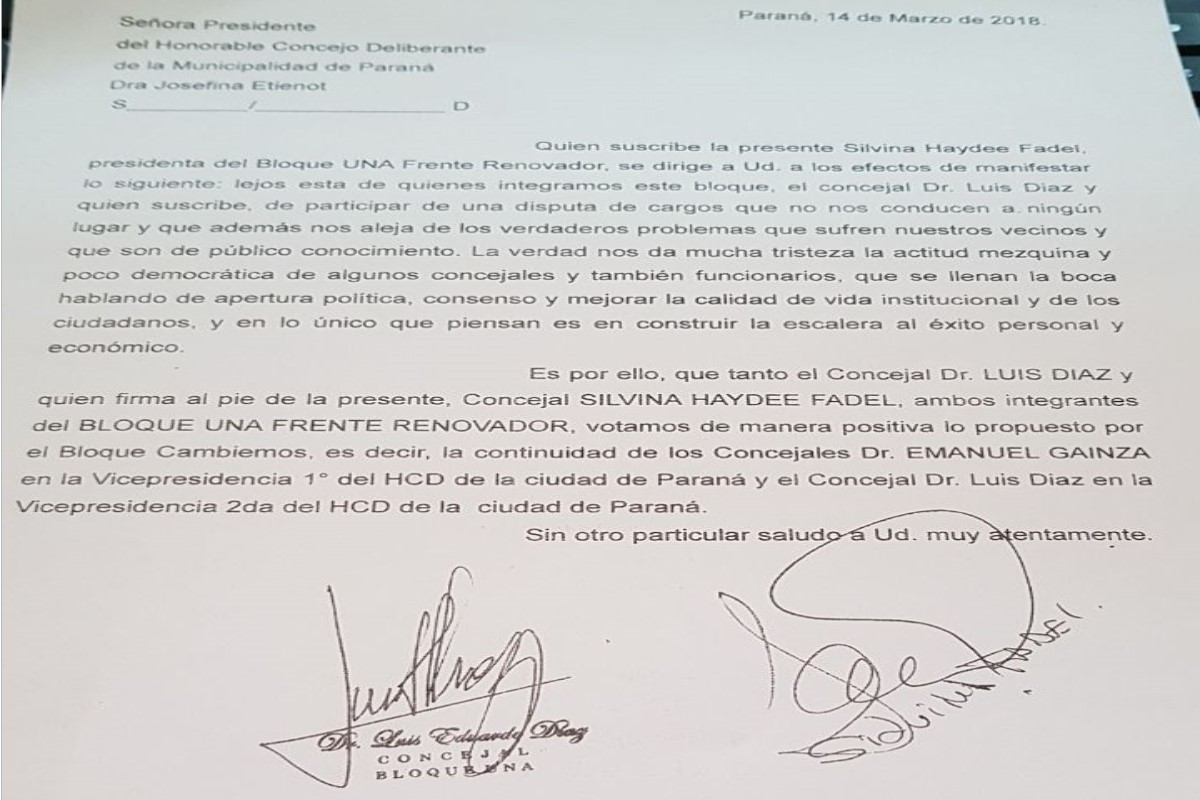 Pero ahora Fadel cambió de posición e informó por escrito a Etienot que, junto a su compañero en el bloque del Frente Renovador, Luis “Toto” Díaz, votarán por la continuidad de Gainza.