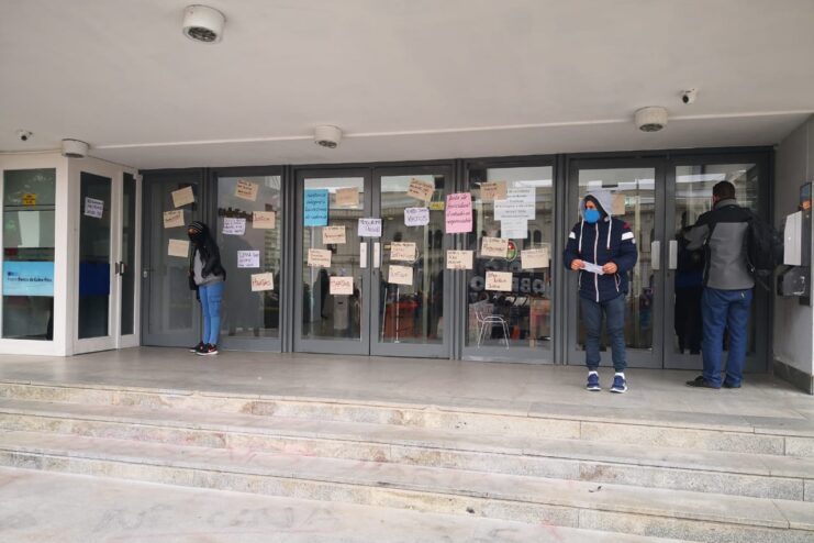 Por redes sociales surgió la convocatoria a la movilización a la que acompañó y convocó la Asamblea de Mujeres, Lesbianas, Travestis, Trans y No Binaries. Las mujeres presentes empapelaron el edificio de calle Laprida en contra de la actuación judicial que tiene innumerables denuncias de Verónica por violencia de género.